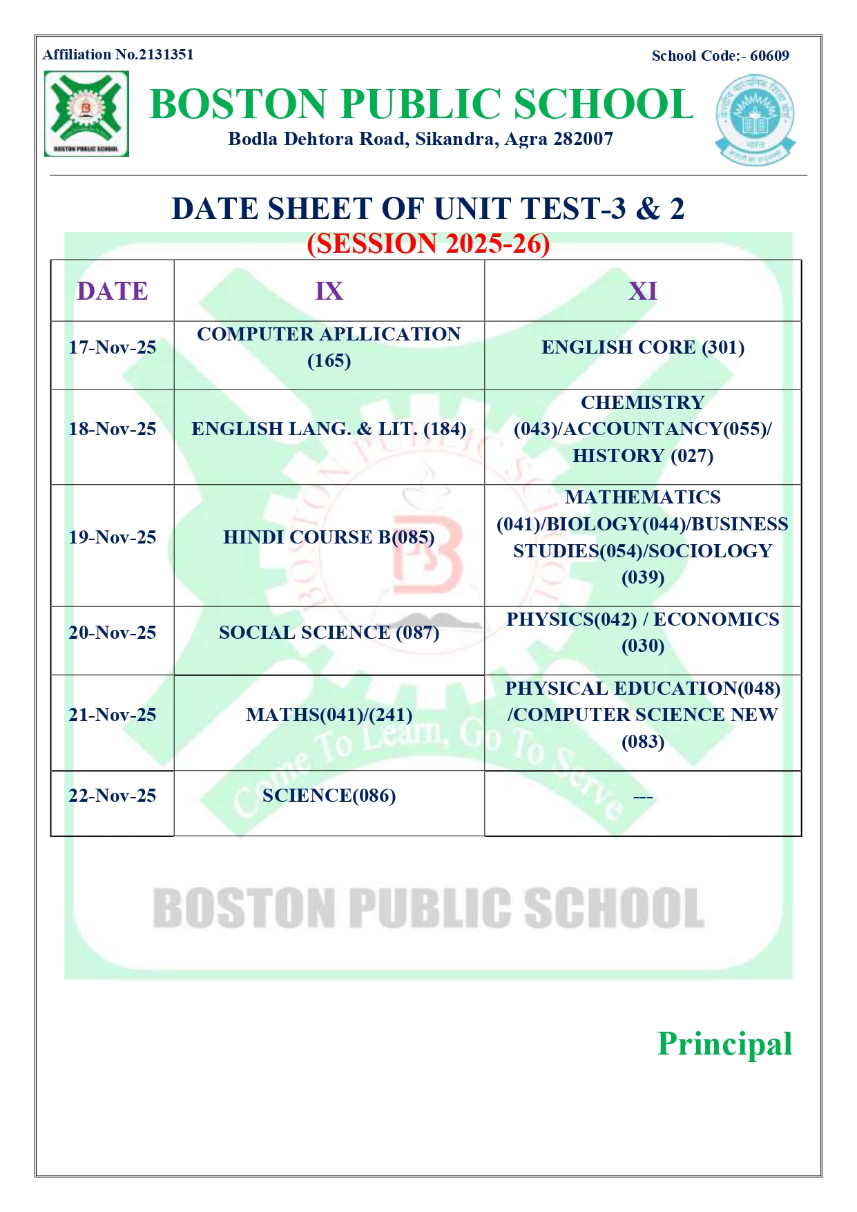 DATE SHEET OF UNIT TEST-3,2 FOR CLASSES IX & XI (SESSION 2025-26)