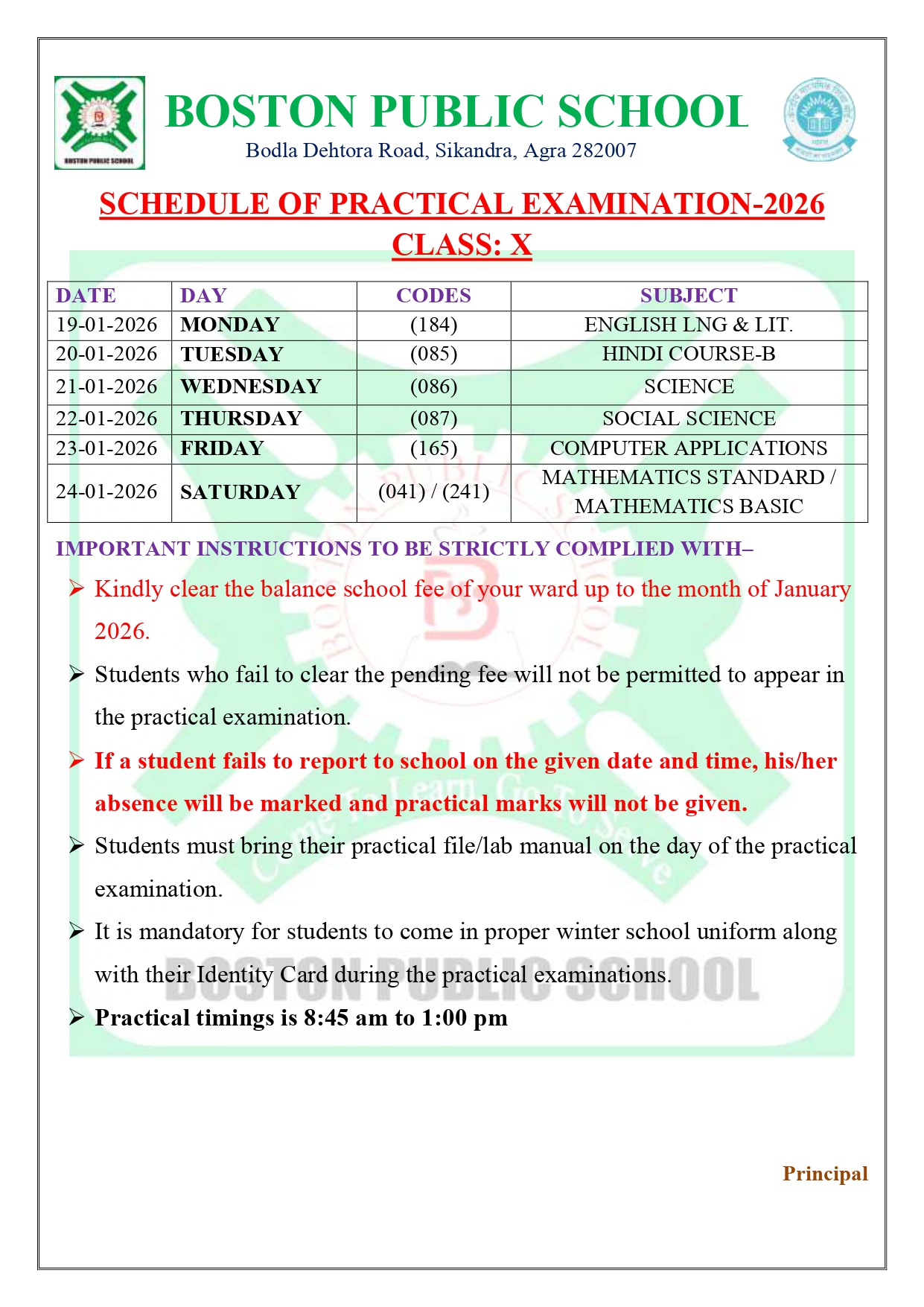 Practical Examination Schedule 2026 for class X
