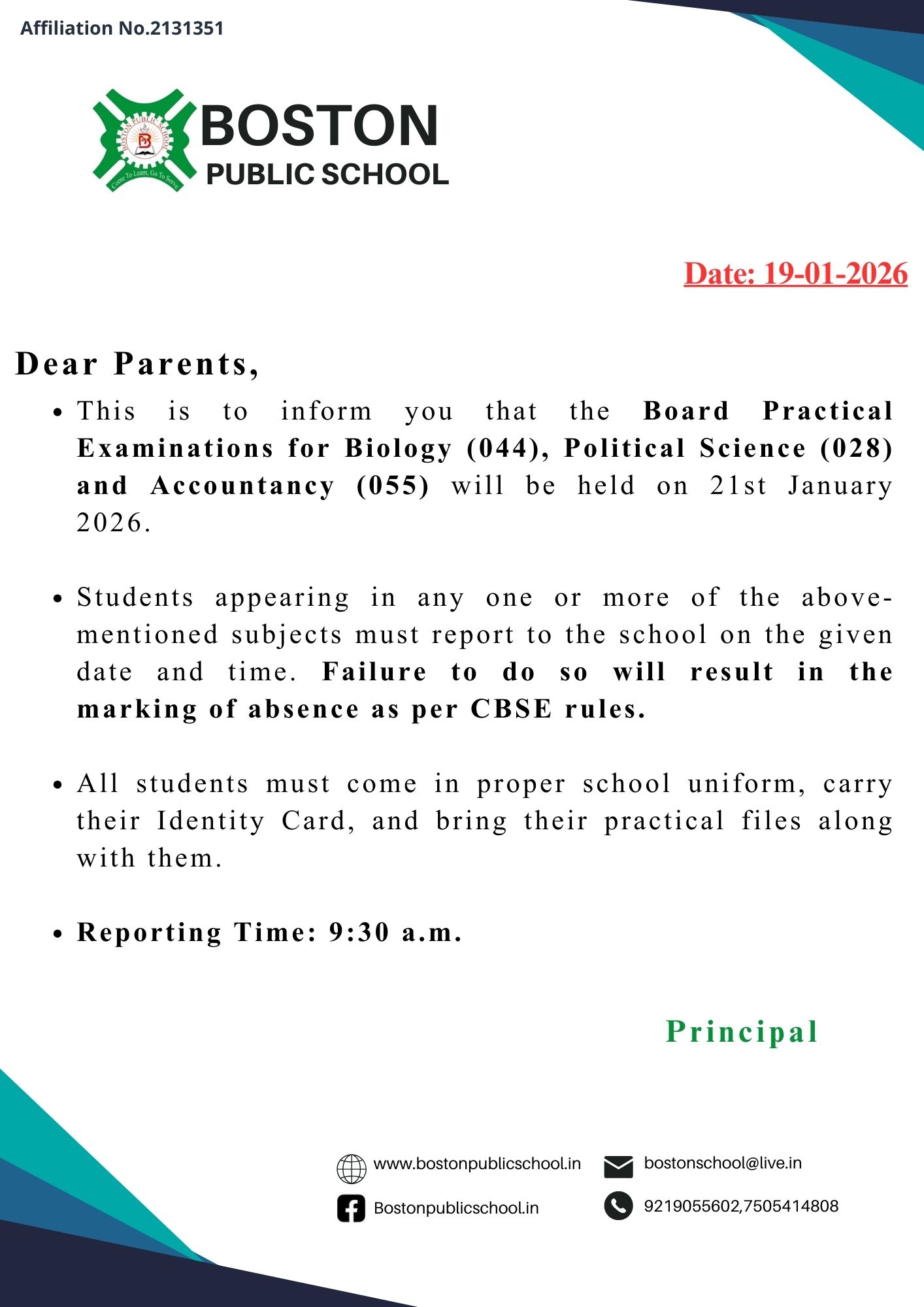 Board Practical Examinations for Biology (044), Political Science (028) and Accountancy (055)