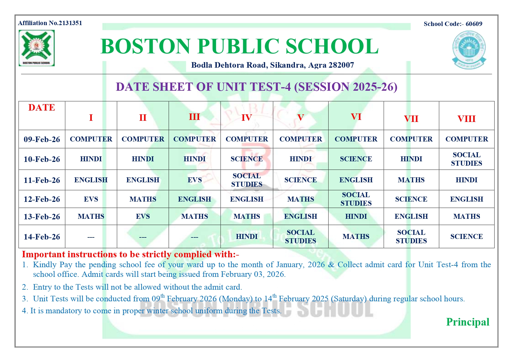 DATE SHEET OF UNIT TEST-4 FOR CLASSES I TO VIII (SESSION 2025-26)