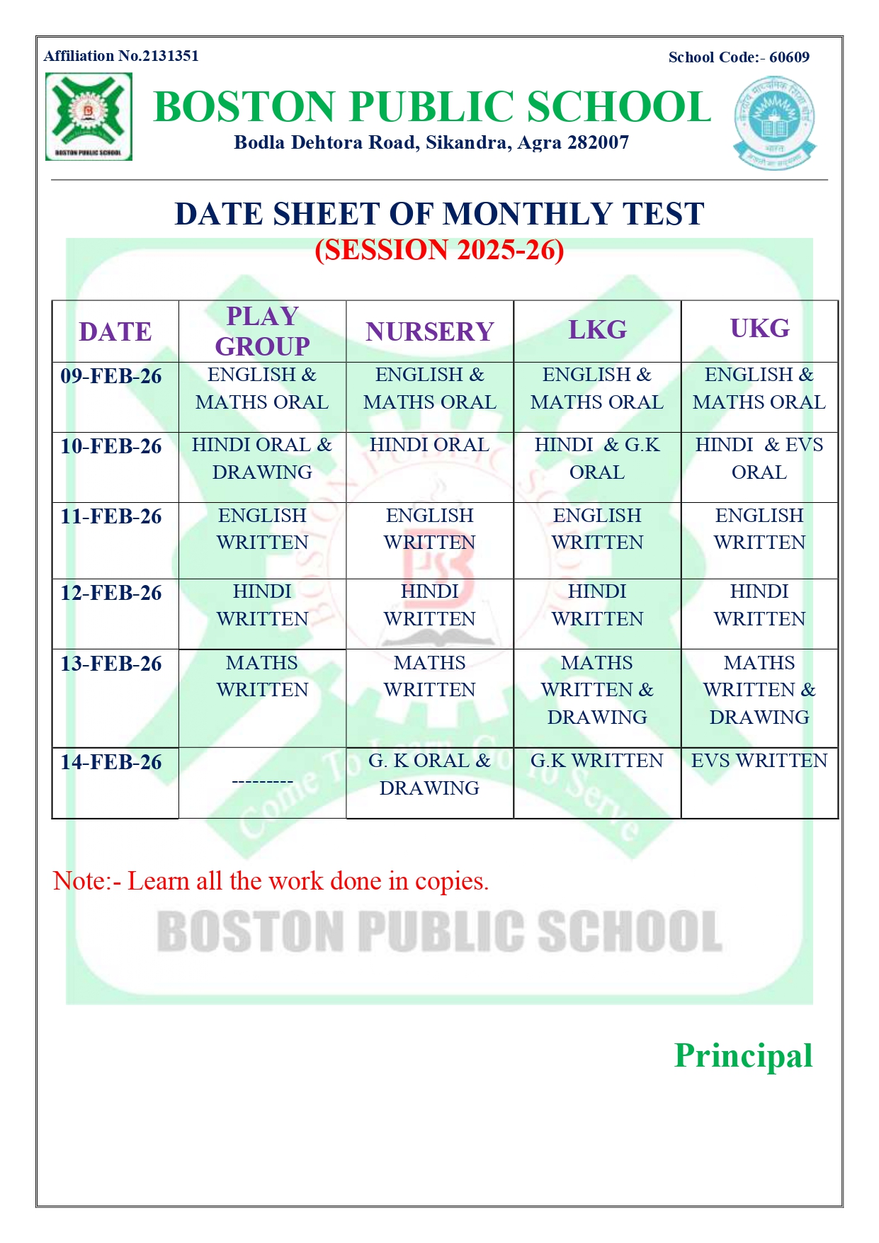 DATE SHEET OF MONTHLY TEST FOR CLASSES PG TO UKG)
