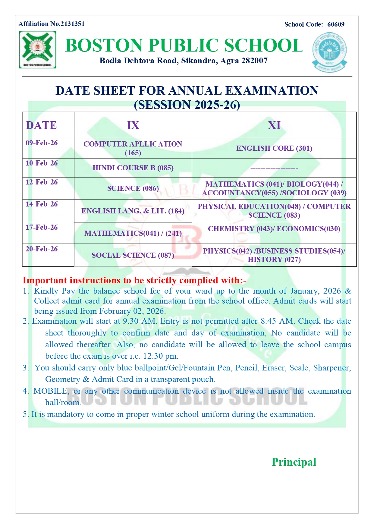 DATE SHEET FOR ANNUAL EXAMINATION OF CLASS IX & XI 2026